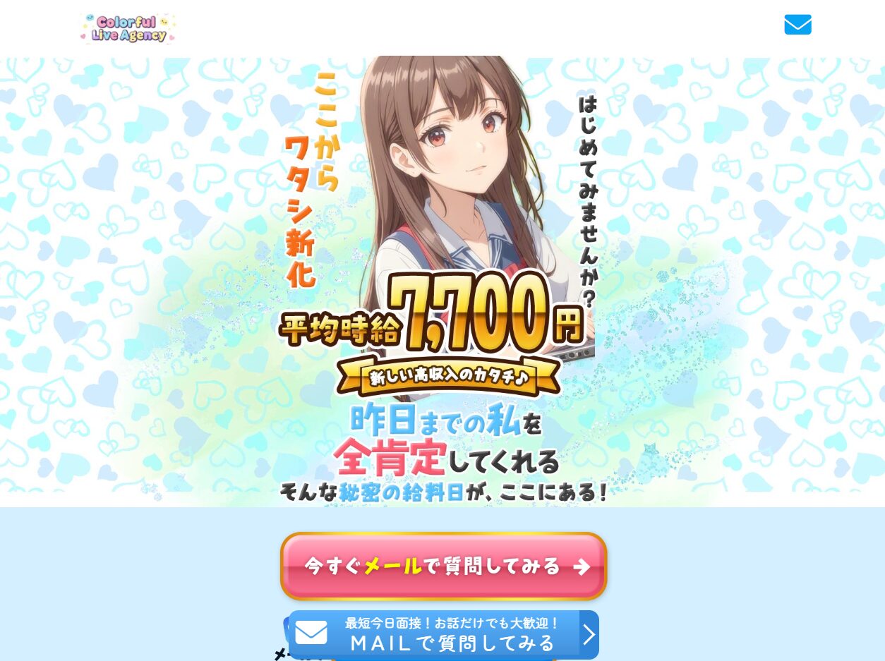 スマホやPCがあれば、すぐに始められるノンアダルトライブチャットのお仕事です。 ・ノンアダルト… 無理に脱いだりHな話をしたりする必要は全くありません。 ・未経験でも安心 … 専属スタッフが丁寧にサポート! ・高収入&日払い … 平均時給7,700円/完全日払い100%をお約束・シフトは完全自由 … 「学校や家事の合間に」「副業として」など、自分のペースでOK!